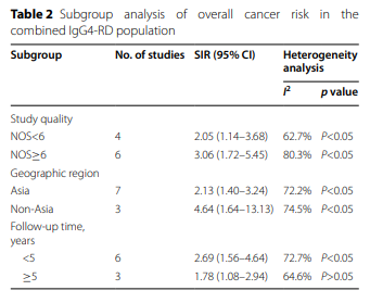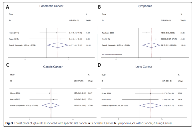 所有研究都報告了惡性腫瘤的總體SIR。只有4篇文章計算了器官特異性惡性腫瘤的SIR,3項研究報告了IgG4-RD診斷前后1年的SIR。 總共有3篇文章需要重新計算癌癥的總體風險。