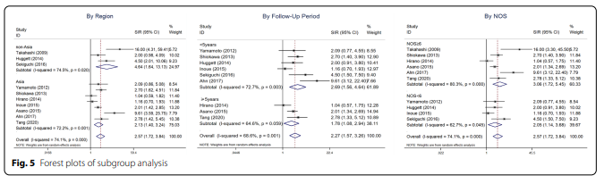 為進一步了解異質性來源,按研究質量、地理區域和平均隨訪時間進行亞組分析(表2)。基于研究質量的分層導致NOS≥6研究的匯總SIR為3.06(95%CI 1.72-5.45),其余研究為2.05(95%CI 1.14-3.68)。根據地理區域的分層顯示,亞洲的集合SIR為2.13(95%CI 1.40–3.24),而非亞洲的SIR為4.64(95%CI 1.64–13.13)。按隨訪時間分層,<5年患者的集合SIR為2.69(95%CI 1.56–4.64),其他為1.78(95%CI 1.08–2.94)。當Takahashi等人[6],Ahn等人[5],Hirano等人[3]和井上等人[10]的研究被排除在外時,I2該值降低至0%,P值>0.05,這強烈表明這些研究產生的異質性。