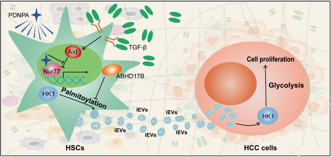 該研究闡明了肝臟纖維化過(guò)程中,TGF-β誘導(dǎo)肝星狀細(xì)胞(HSCs)中己糖激酶HK1的棕櫚酰化修飾,促進(jìn)HK1通過(guò)細(xì)胞外囊泡外泌,而肝癌細(xì)胞則劫持纖維化HSCs來(lái)源的胞外囊泡HK1來(lái)增強(qiáng)自身糖酵解能力從而促進(jìn)肝癌細(xì)胞增殖;此外,研究發(fā)現(xiàn)小分子化合物PDNPA通過(guò)靶向核受體Nur77阻斷TGF-β誘導(dǎo)的HK1外泌,進(jìn)而抑制肝癌進(jìn)程,揭示PDNPA抑制HK1外泌的新功能。