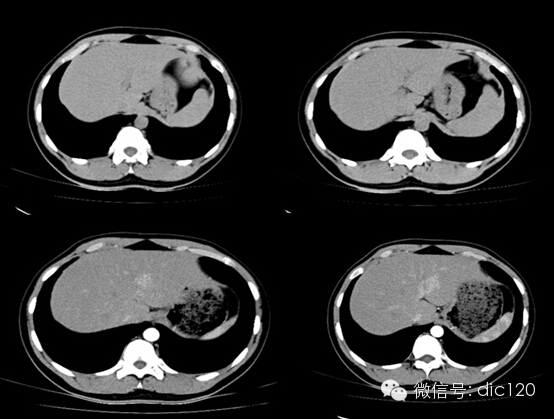 患者,女,50歲,農民。 因右上腹疼痛1月余,外院B超診斷為肝癌入我院治療。既往無肝炎病史,無飲酒史,無遺傳病史,無高血壓糖尿病史。 體檢:神志清楚,正力體型,皮膚鞏膜無黃染;心肺聽診未見異常;腹軟,肝脾肋下未及,腹水征陰性,雙下肢無水腫。 入院后輔助檢查:甲胎蛋白正常,肝功能正常,血常規正常,便常規見膿球1~3個,HBV和HCV相關病原學檢查陰性。 CT檢