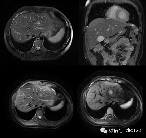纖維板層型肝癌:可出現中央瘢痕,但其較FNH的明顯粗大,并可見斑點狀鈣化,T1WI、T2WI均為低信號,無強化。