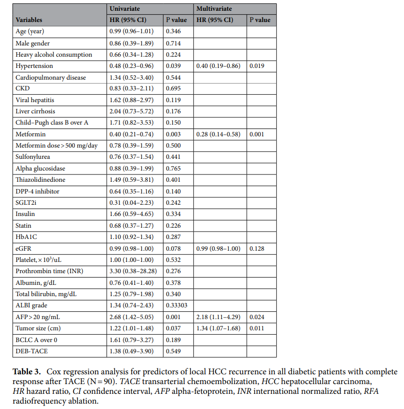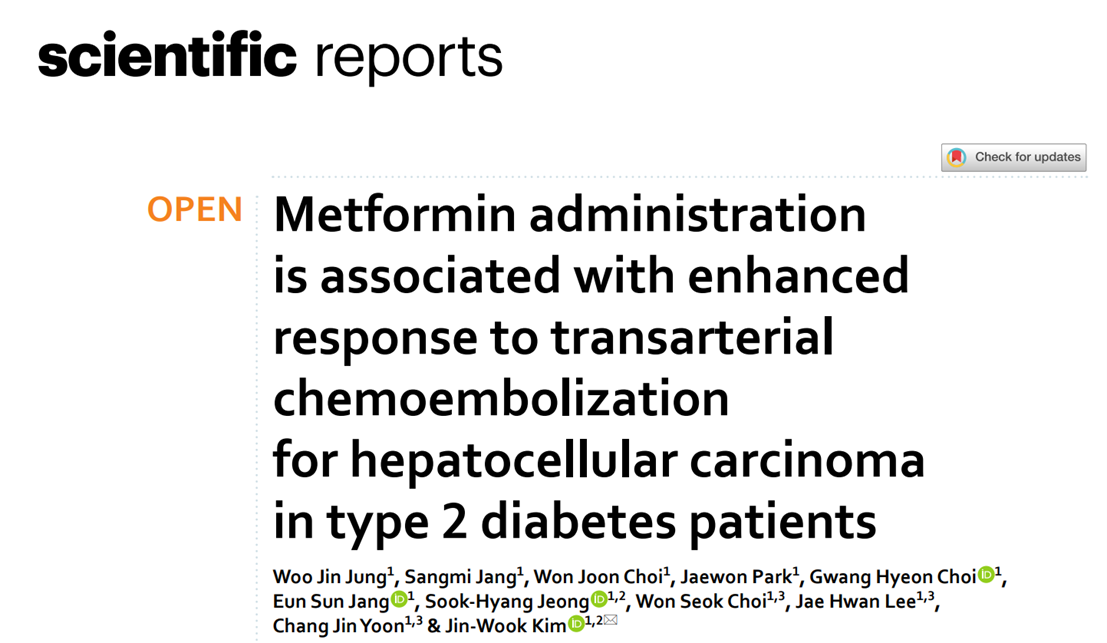 Jung WJ, Jang S, Choi WJ, Park J, Choi GH, Jang ES, Jeong SH, Choi WS, Lee JH, Yoon CJ, Kim JW. Metformin administration is associated with enhanced response to transarterial chemoembolization for hepatocellular carcinoma in type 2 diabetes patients. Sci Rep. 2022 Aug 25;12(1):14482. doi: 10.1038/s41598-022-18341-2. PMID: 36008432; PMCID: PMC9411109.