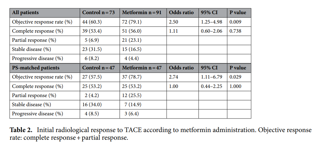 2顯示初始 TACE 4 周根據 mRECIST 標準的總體和 PS 匹配患者的放射學緩解率。二甲雙胍組的客觀緩解(即完全緩解(CR)和部分緩解(PR)之和)率顯著高于對照組: