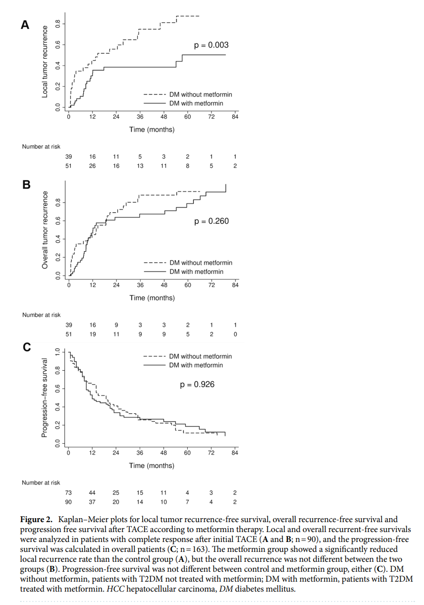 二甲雙胍是2型糖尿病(T2DM)的一線治療方法,作為包括HCC在內的幾種癌癥的預防措施而受到關注。然而,二甲雙胍對已知HCC患者的影響研究較少。二甲雙胍對肝細胞癌生存的影響是有爭議的,二甲雙胍是否會影響TACE的結局也尚無定論。因此,本研究旨在評估二甲雙胍是否影響TACET2DM患者早期HCC的治療結果。