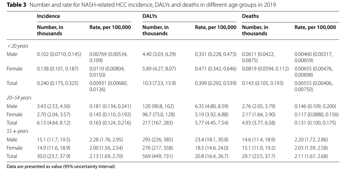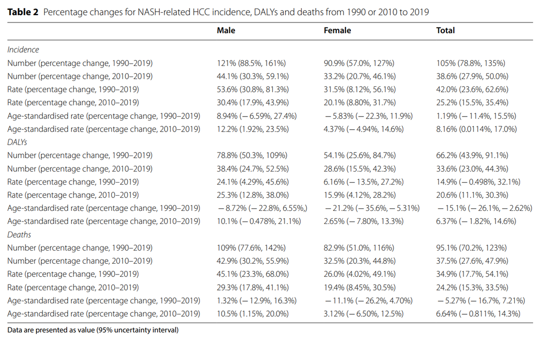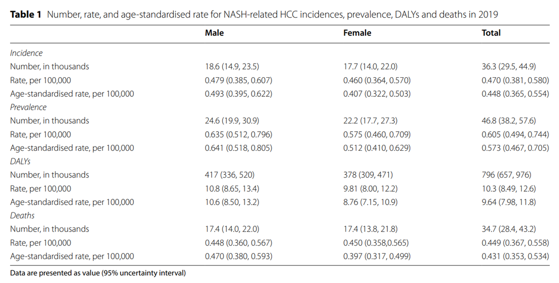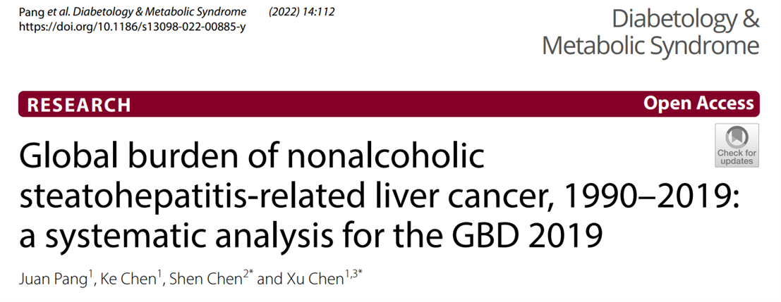 Pang J, Chen K, Chen S, Chen X. Global burden of nonalcoholic steatohepatitis-related liver cancer, 1990-2019: a systematic analysis for the GBD 2019. Diabetol Metab Syndr. 2022 Aug 9;14(1):112. doi: 10.1186/s13098-022-00885-y. PMID: 35941673; PMCID: PMC9361538.