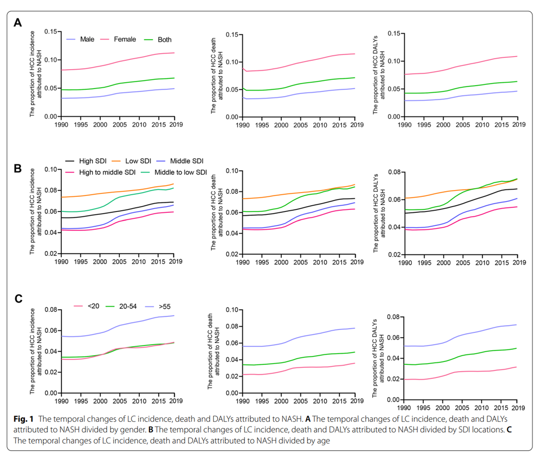 研究還發(fā)現(xiàn),在不同的社會人口指數(shù)(SDI)位置,NASH相關(guān)LC負(fù)擔(dān)存在很大差異。1990 - 2019年,SDI中等地區(qū)的粗?jǐn)?shù)字和年齡標(biāo)準(zhǔn)化發(fā)病率、DALYs和死亡率最高,高SDI地區(qū)的NASH相關(guān)LC負(fù)擔(dān)增加最大。此外,1990年歸因于NASH的LC發(fā)病率,死亡和DALYs的比例分別為4.74%,5.30%和4.25%,2019年分別增加了43.5%,35.3%和49.4%。