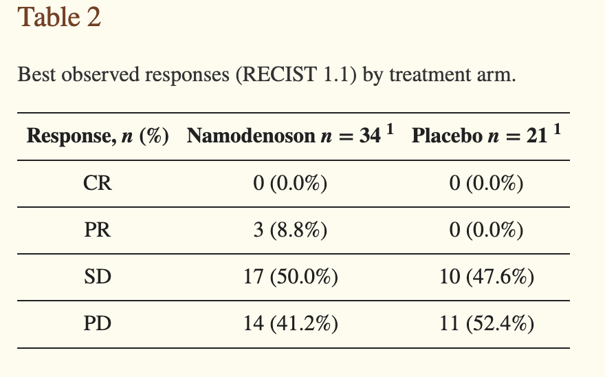 另外,試驗中有55名患者進(jìn)行了反應(yīng)評估。Namodenoson組進(jìn)行了評估的34名患者中,3人部分緩解,17人疾病穩(wěn)定,客觀緩解率8.8%,疾病控制率58.8%。而安慰劑組參與評估的21名患者只有10人達(dá)到了疾病穩(wěn)定,客觀緩解率0%,疾病控制率47.6%。
