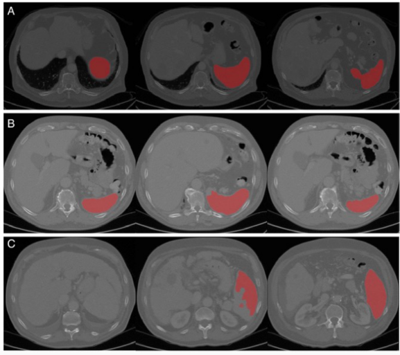 圖 算法性能的代表性圖像(從左到右是脾臟上部、中部和下部的圖像)。A完美的分割,B可接受的分割(中間有輕微的分割錯(cuò)誤),C差的分割(上部有主要的分割錯(cuò)誤,有吻合的肝臟和脾臟現(xiàn)象)