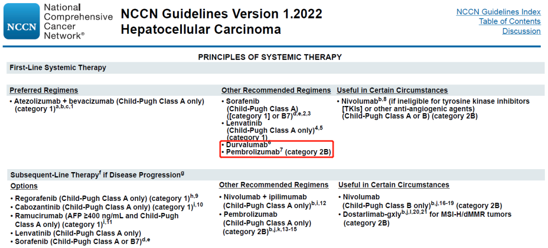 2022年第1版肝癌NCCN指南推薦度伐利尤單抗(2A類證據(jù))、帕博利珠單抗(2B類證據(jù))用于晚期肝癌一線治療。