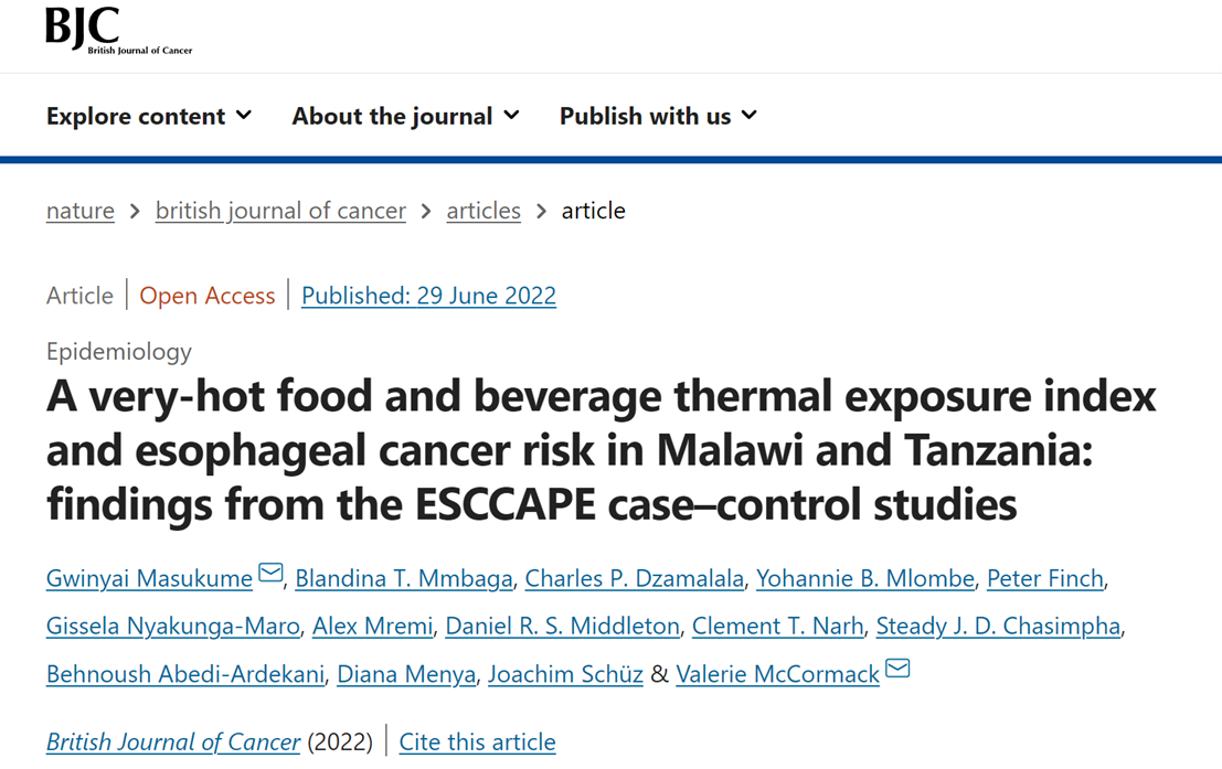 Masukume, G., Mmbaga, B.T., Dzamalala, C.P., et al., (2022). A very-hot food and beverage thermal exposure index and esophageal cancer risk in Malawi and Tanzania: findings from the ESCCAPE case–control studies. Br J Cancer, DOI: https://doi.org/10.1038/s41416-022-01890-8