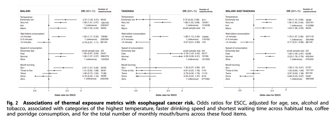 根據(jù)馬拉維布蘭太爾(2017-20)和坦桑尼亞乞力馬扎羅山(2015-19)的ESCCAPE病例對(duì)照研究,研究人員使用針對(duì)國(guó)家、年齡、性別、酒精和煙草調(diào)整回歸模型,估計(jì)飲用茶、咖啡和/或粥時(shí)自我報(bào)告的熱暴露的比值比(OR)和95%可信區(qū)間(CI)。