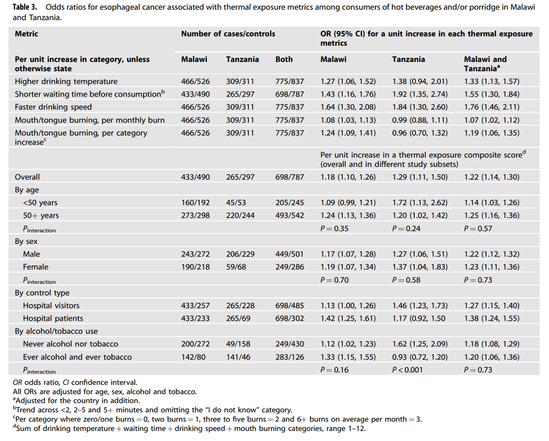 在目前馬拉維和坦桑尼亞進(jìn)行的病例對(duì)照研究中,研究人員調(diào)查了攝入食物/飲料期間熱暴露的自我報(bào)告標(biāo)志物,并分別在四個(gè)熱暴露指標(biāo)和綜合評(píng)分中研究了ESCC風(fēng)險(xiǎn)。