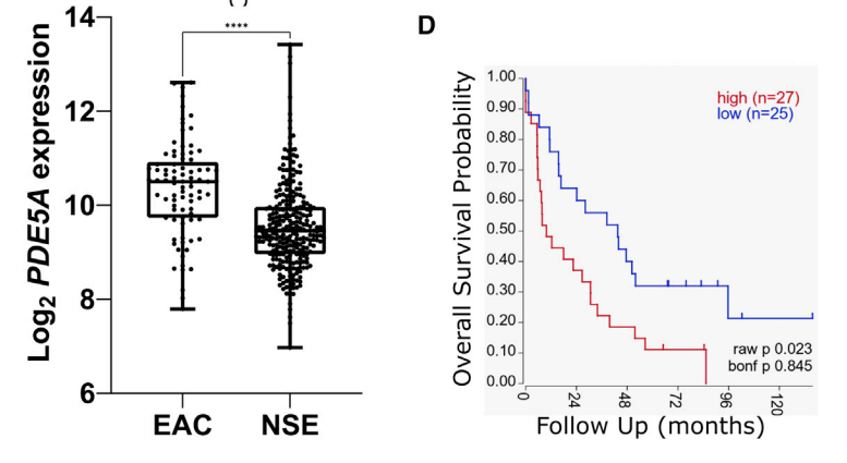 在這項研究中,研究團隊發(fā)現(xiàn),與健康的食管組織相比,食管腺癌細胞中5-磷酸二酯酶(PDE5)顯著高表達,而在腫瘤微環(huán)境中的癌癥相關(guān)成纖維細胞(CAF)同樣高表達 PDE5。同時,PDE5 的高表達與較差的總生存率相關(guān),這表明 PDE5 可能是一個有效的食管腺癌治療靶點。